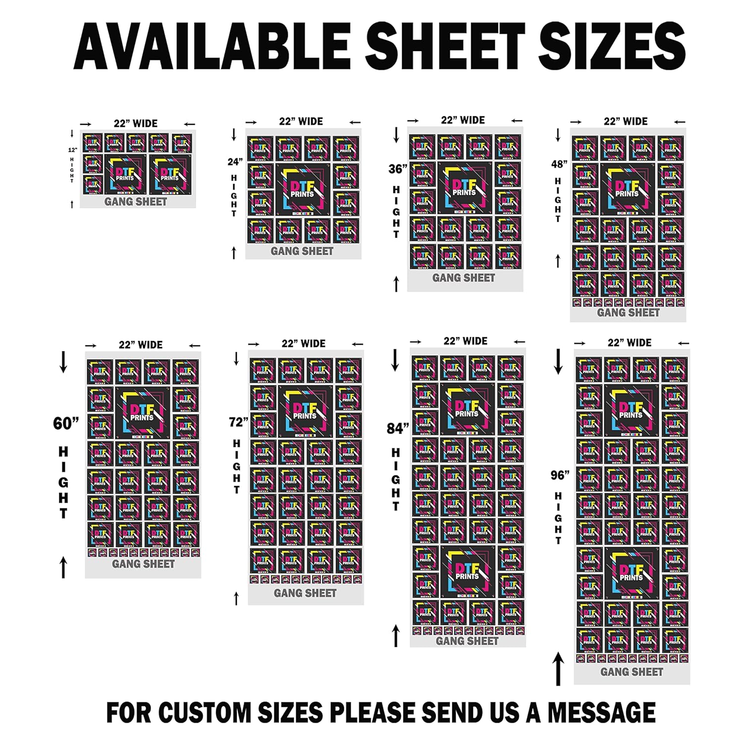 DTF Gang Sheet | 22X24 (2FT), 22X60 (5FT), 22X84 (7FT), 22X120 (10FT), 22X180 (15FT), 22X240 (20FT), 22X360 (30FT) |